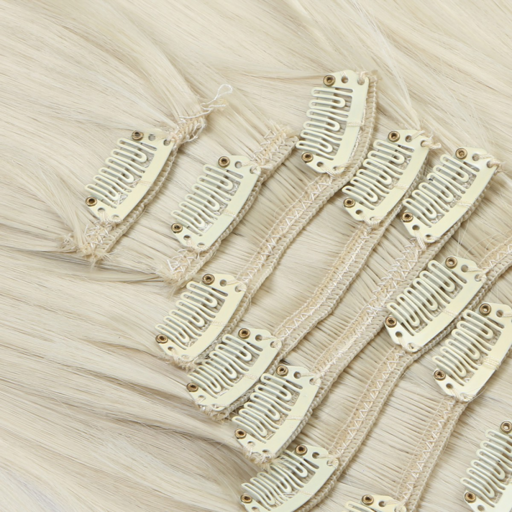 Mit Clip In Extensions in ein paar Minuten zur Traumfrisur. Mit diesem Haarverlängerung Set lassen sich Kurzhaarfrisuren im Handumdrehen zu Langhaarfrisuren machen. Auch ideal für kurzfristiges Verdichten der Eigenhaare geeignet. Die einfache Befestigungstechnik ermöglicht ein schnelles Anbringen und entfernen der Haartressen aus Ihrem Eigenhaar.
